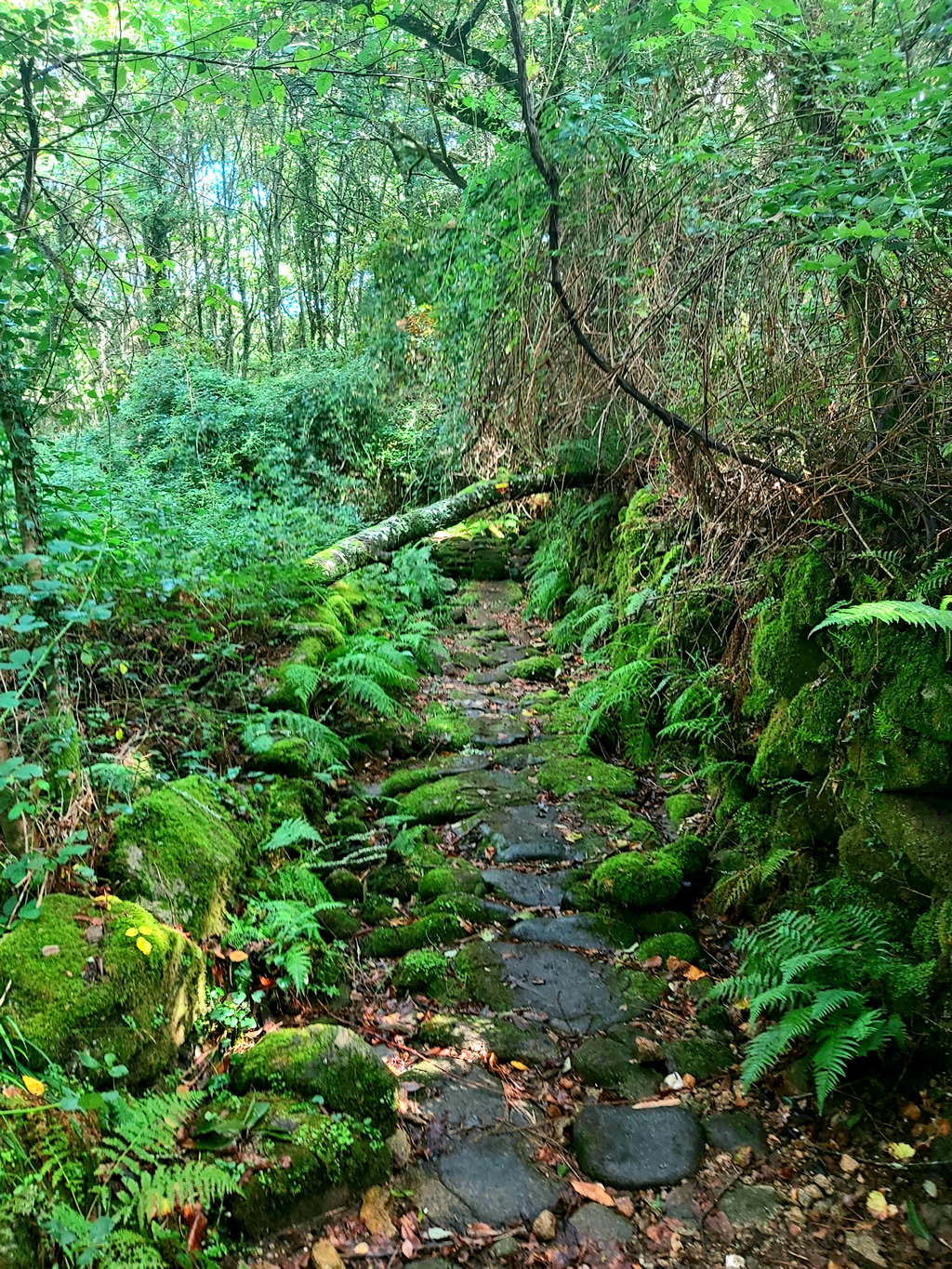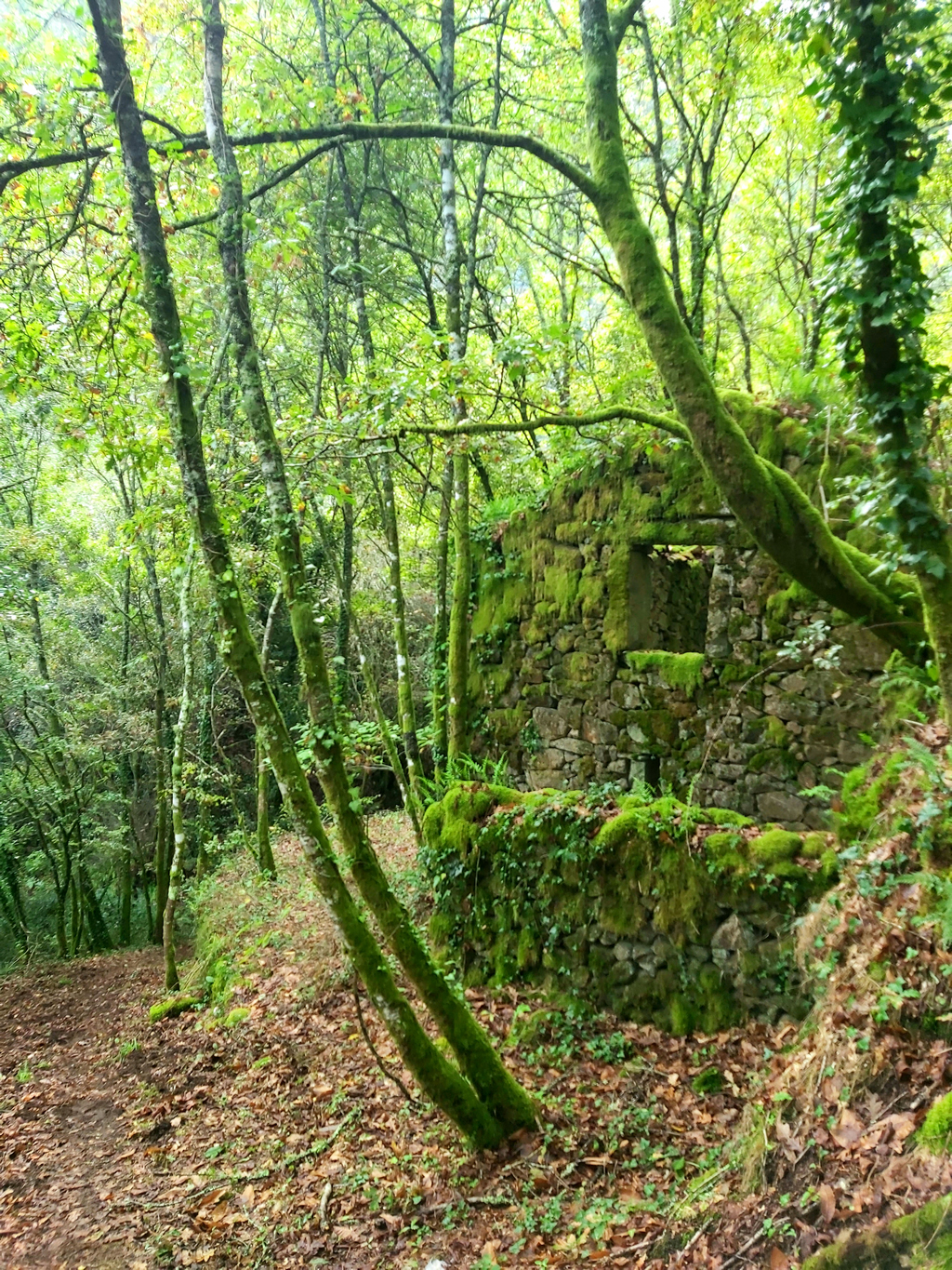 Com uma breve passagem no "caminho da Rainha" - estrada nacional substituída pela EN16 – inicia-se a descida, em grande parte, observando o trilho percorrido no sentido ascendente e do outro lado do rio. Na paisagem ribeirinha sobressaem os vários moinhos em ruínas e suas levadas, vestígios de como o homem e a Natureza outrora operaram em harmonia.